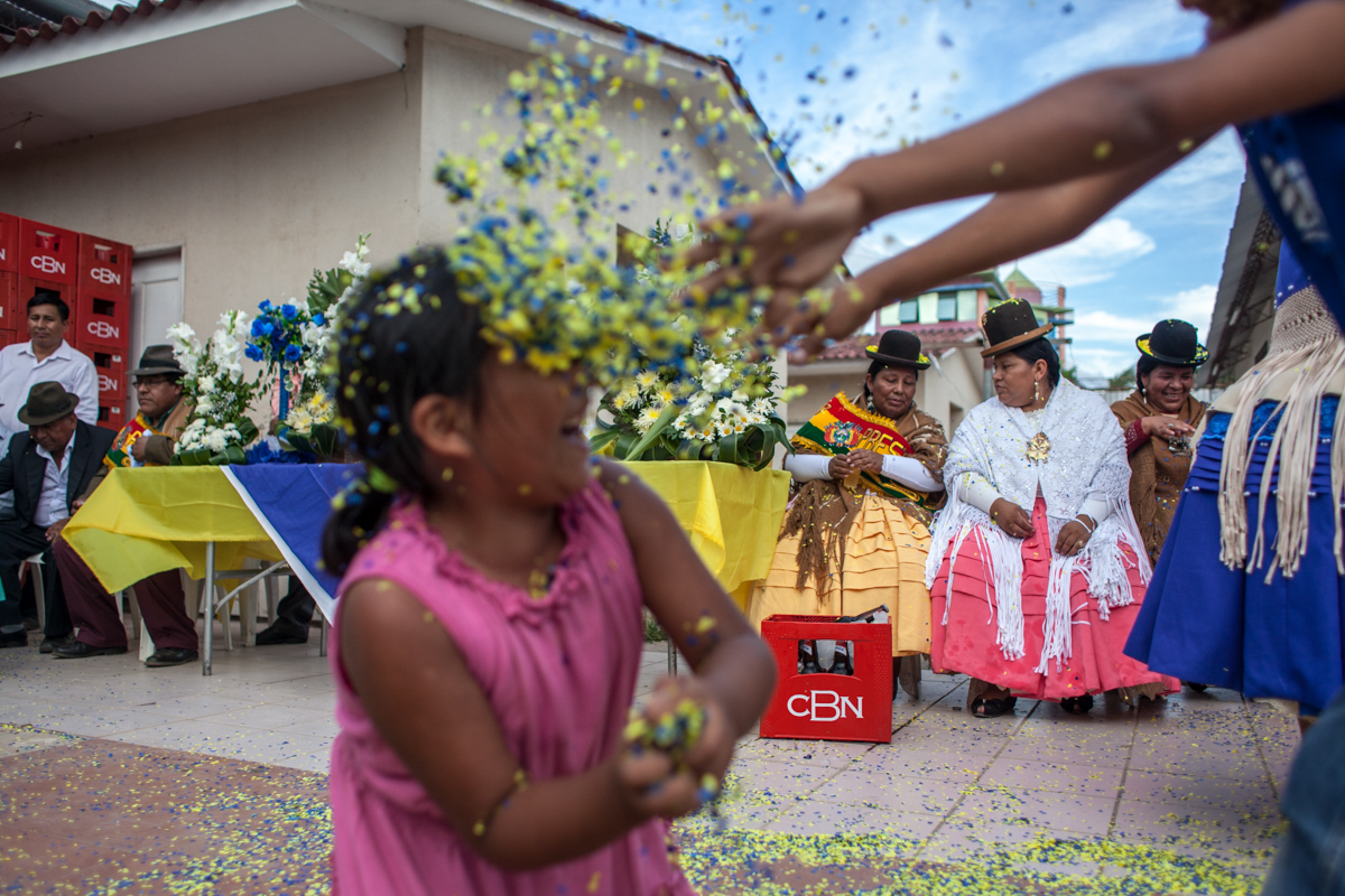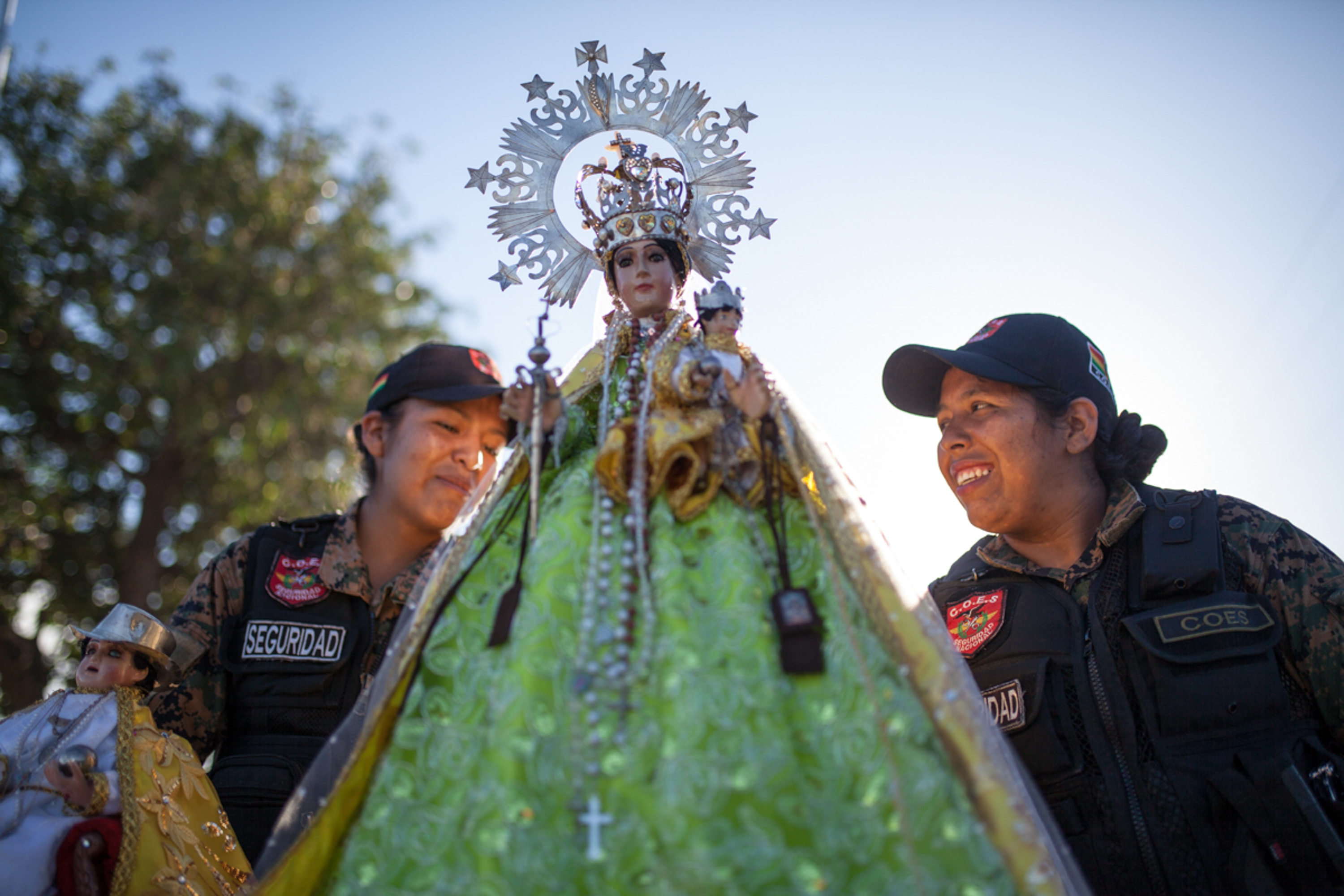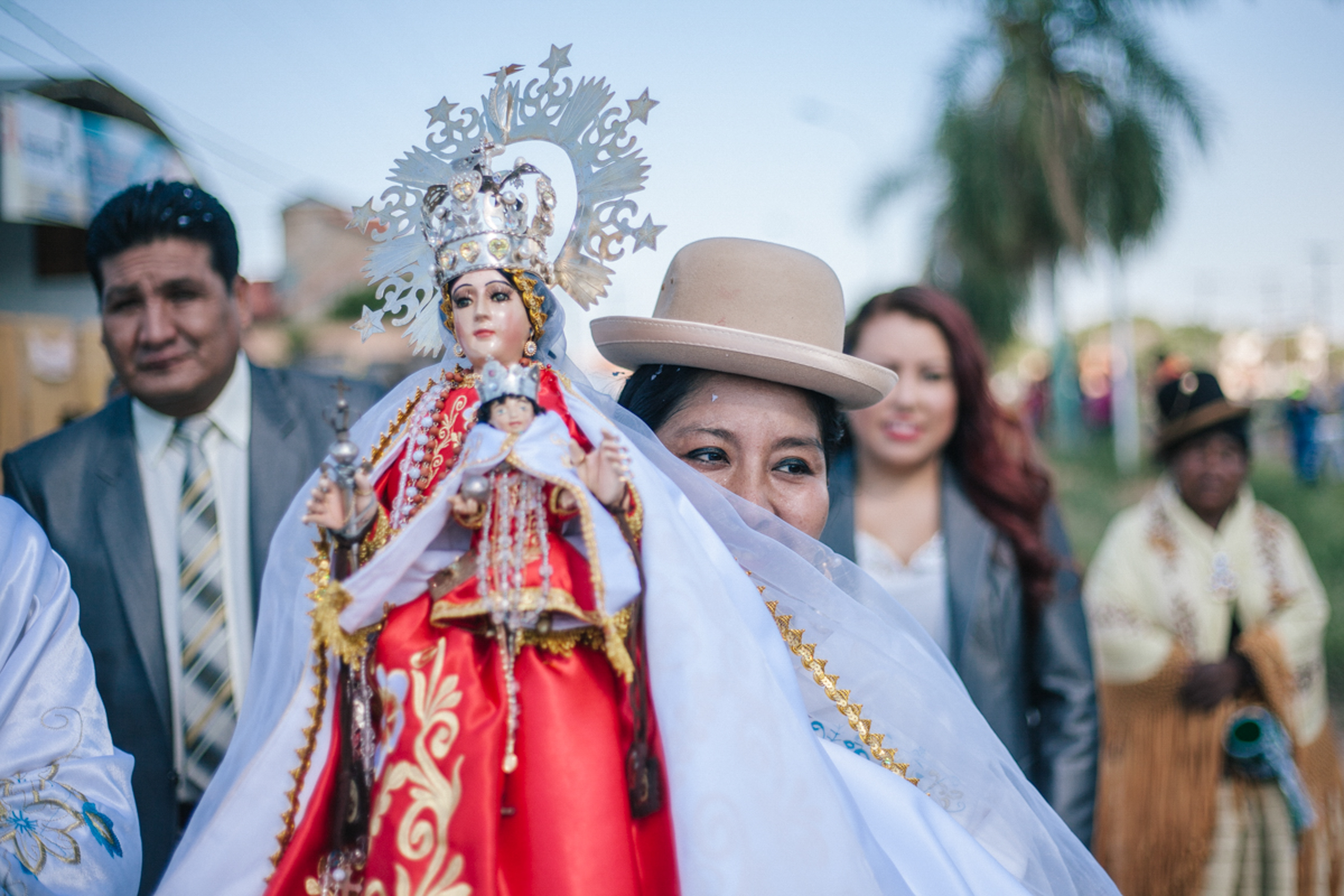 Cada domingo a mediodía, como si de una misa se tratara, tiene lugar la ceremonia de adoración, la promesa a la virgen y más tarde el desfile, encabezado por su figura y la del niño, en el que cientos de cholitas, bailan con sus trajes suntuosos al ritmo de la banda de vientos y percusiones que marca el compás desde la retaguardia.