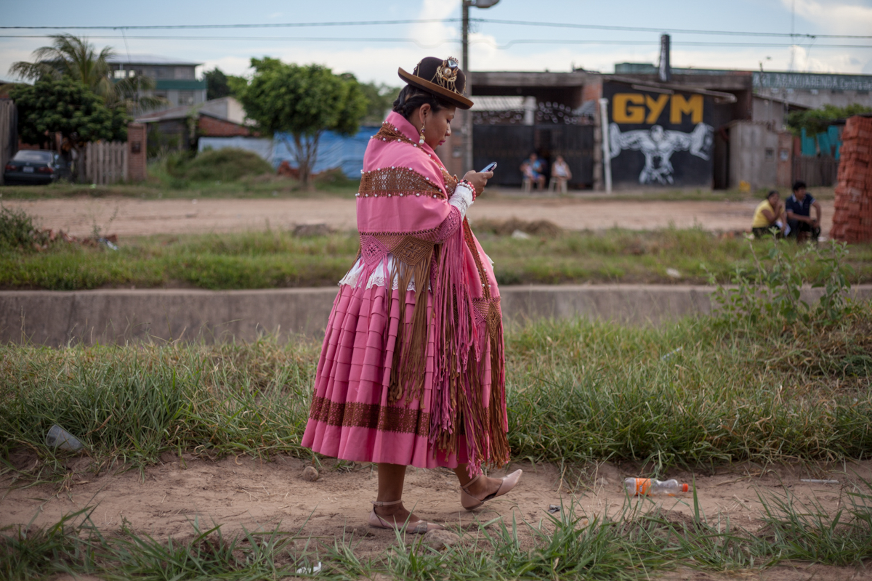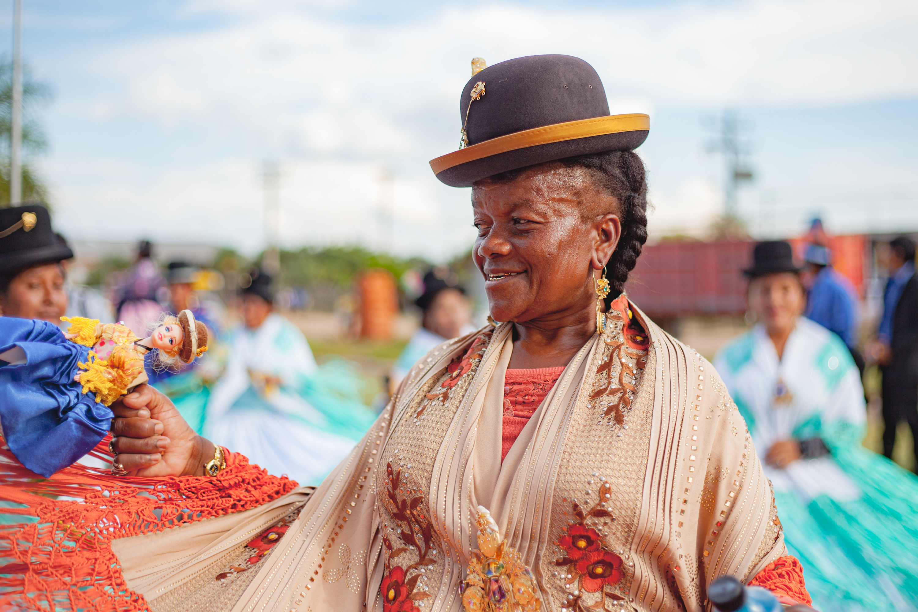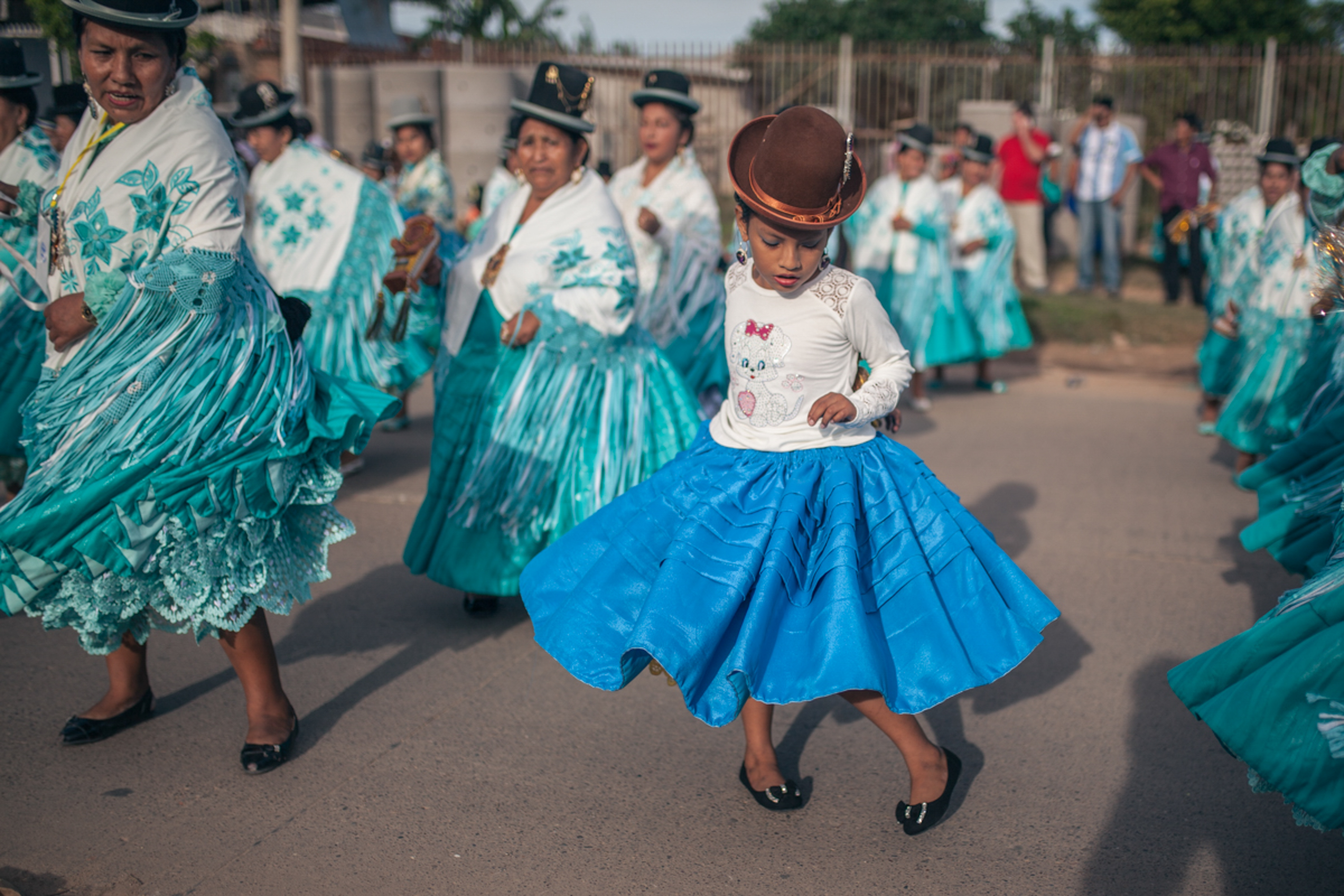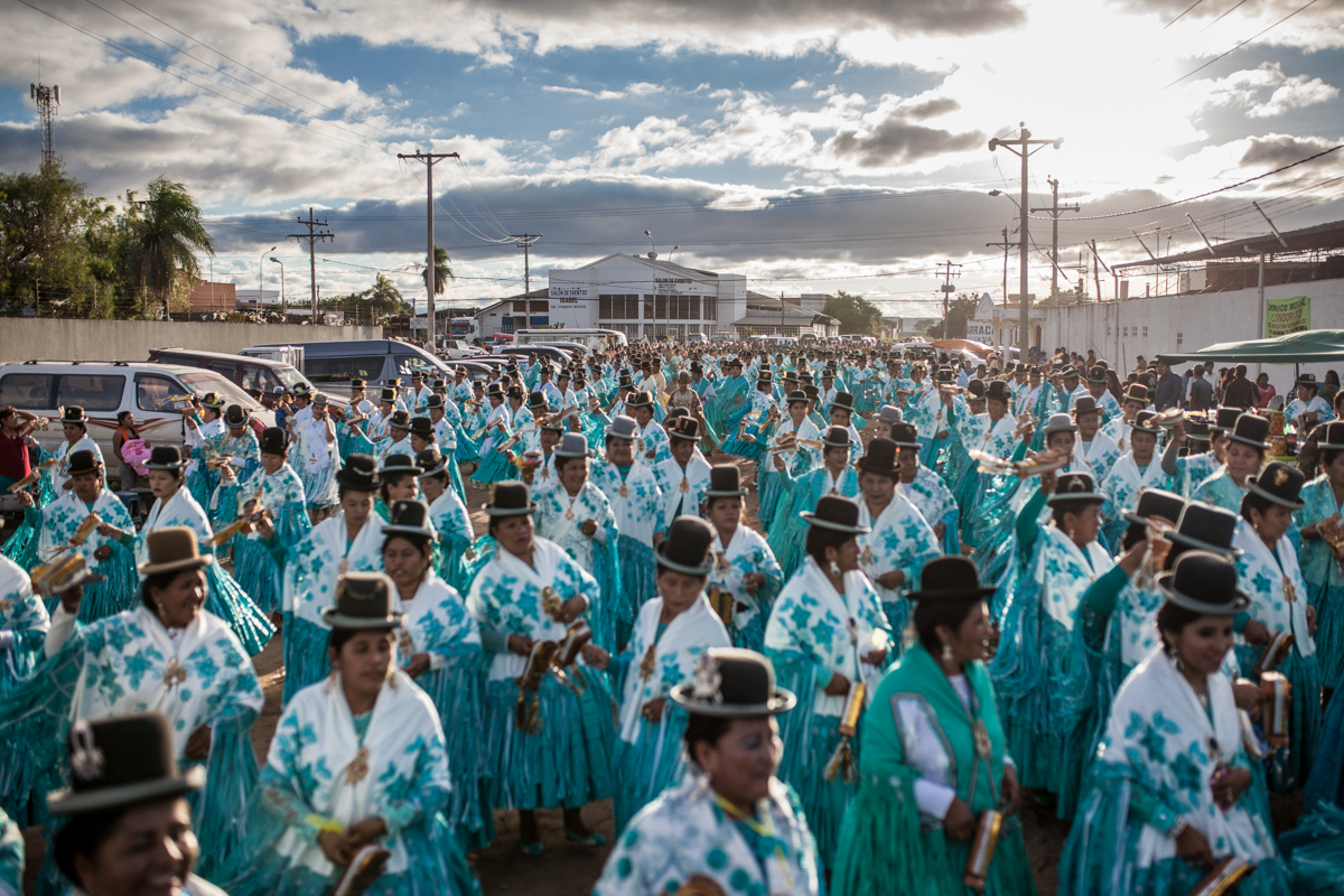 Bajo el rayo del sol o la lluvia inclemente del clima cruceño, las mujeres visten sus polleras —no faldas—, que muchas veces llegan a sumar siete capas, su manta y su sombrero, como si continuaran en las alturas secas de La Paz. Avanzan lento, con una sincronía que hipnotiza y ordenadas en filas a lo largo de un par de kilómetros en una peregrinación musical que llama a los curiosos y transmite la alegría del conjunto a quienes paran a chusmear o se asoman a los balcones.