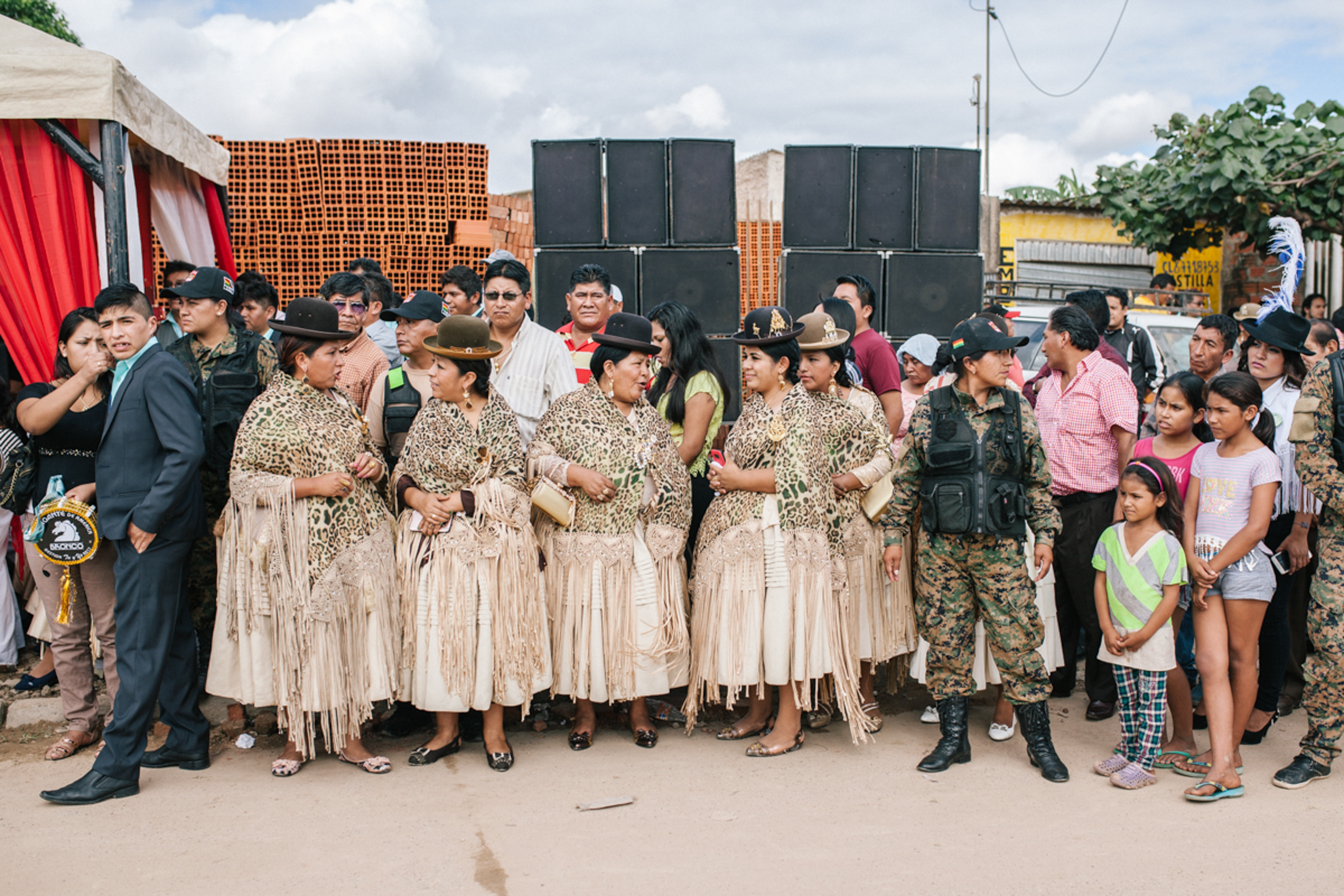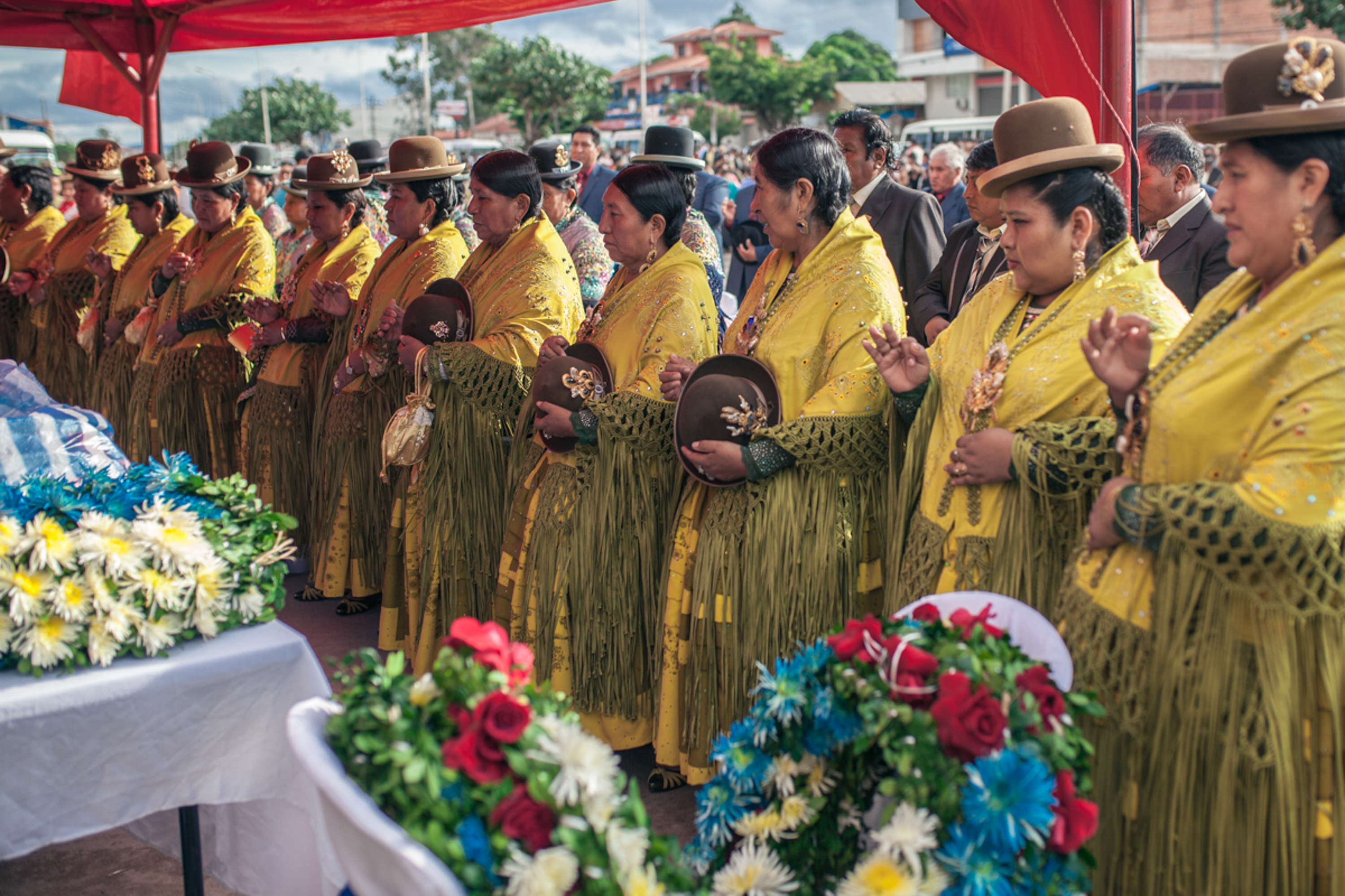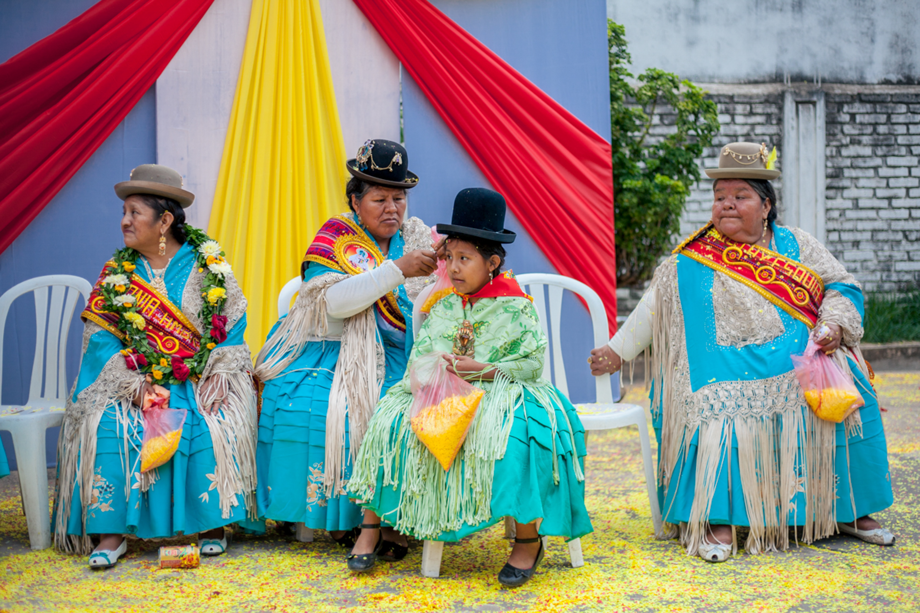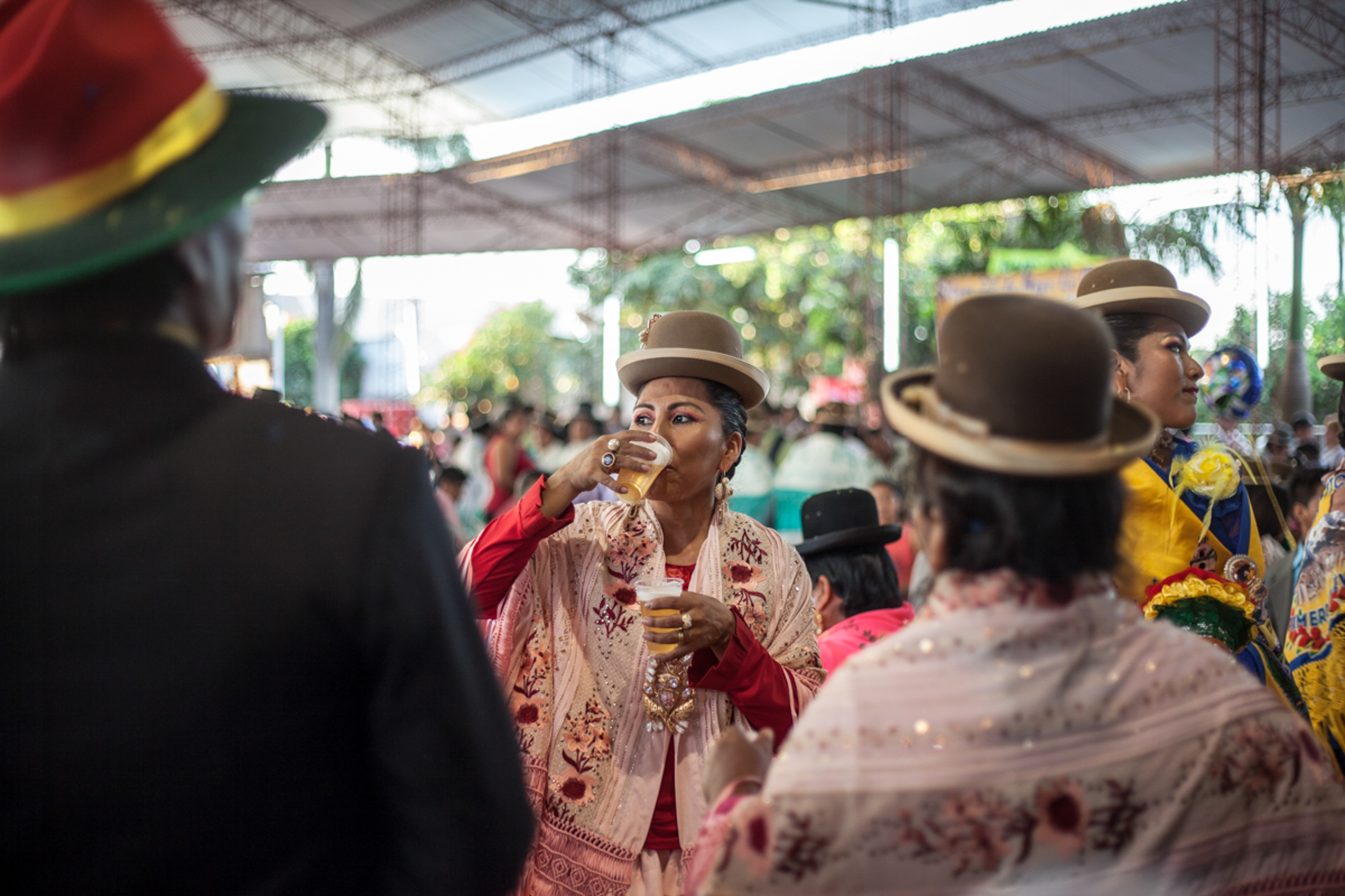 Bajo el rayo del sol o la lluvia inclemente del clima cruceño, las mujeres visten sus polleras —no faldas—, que muchas veces llegan a sumar siete capas, su manta y su sombrero, como si continuaran en las alturas secas de La Paz. Avanzan lento, con una sincronía que hipnotiza y ordenadas en filas a lo largo de un par de kilómetros en una peregrinación musical que llama a los curiosos y transmite la alegría del conjunto a quienes paran a chusmear o se asoman a los balcones.