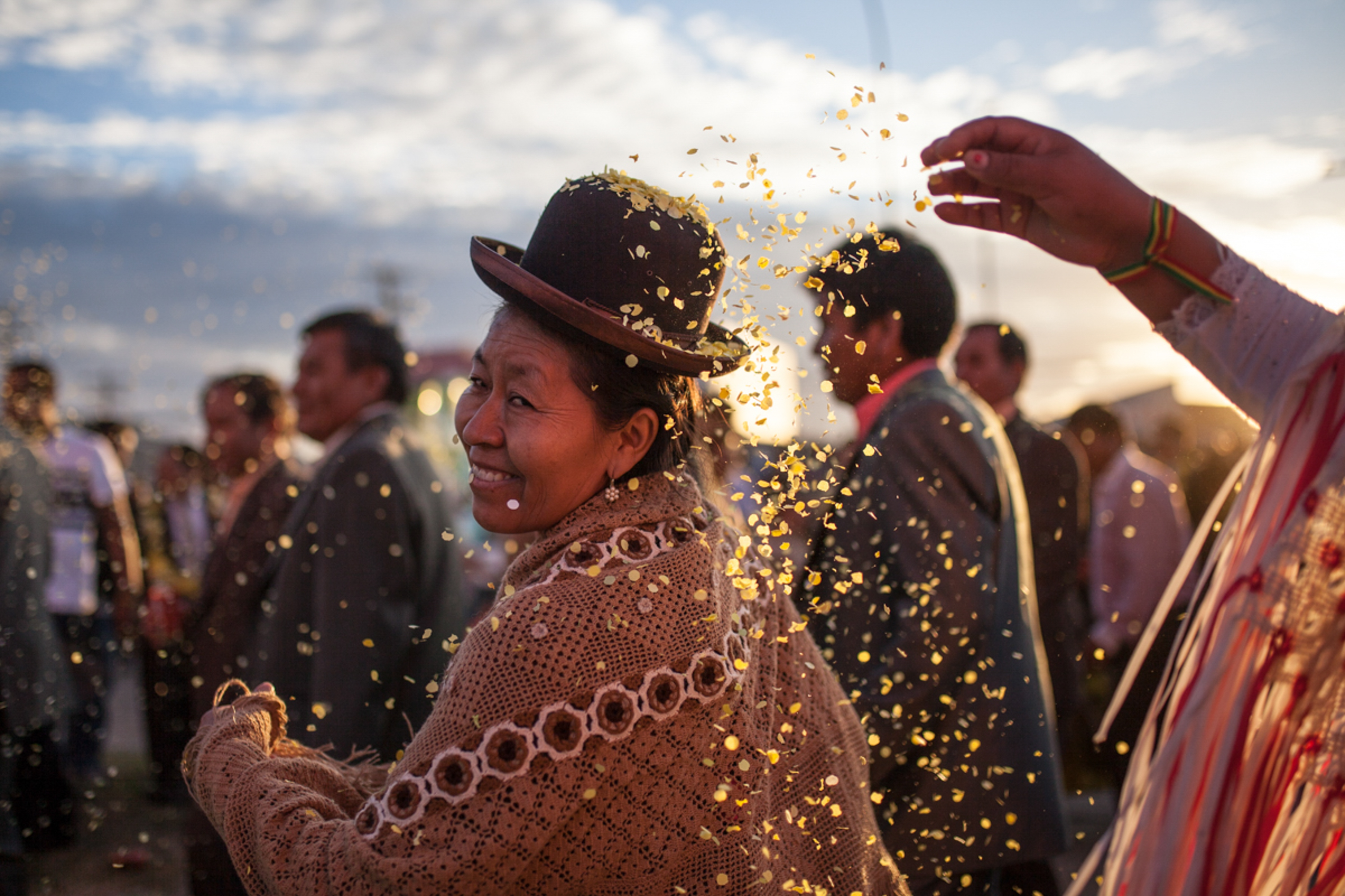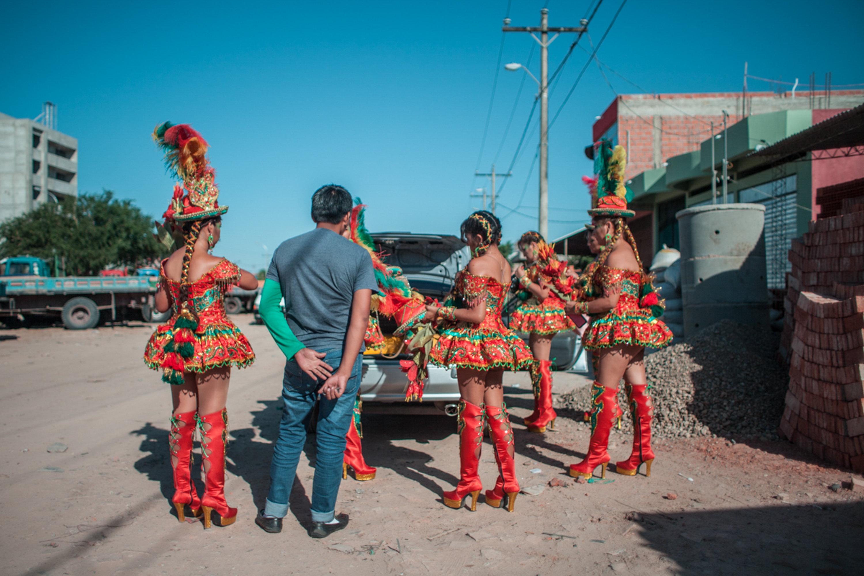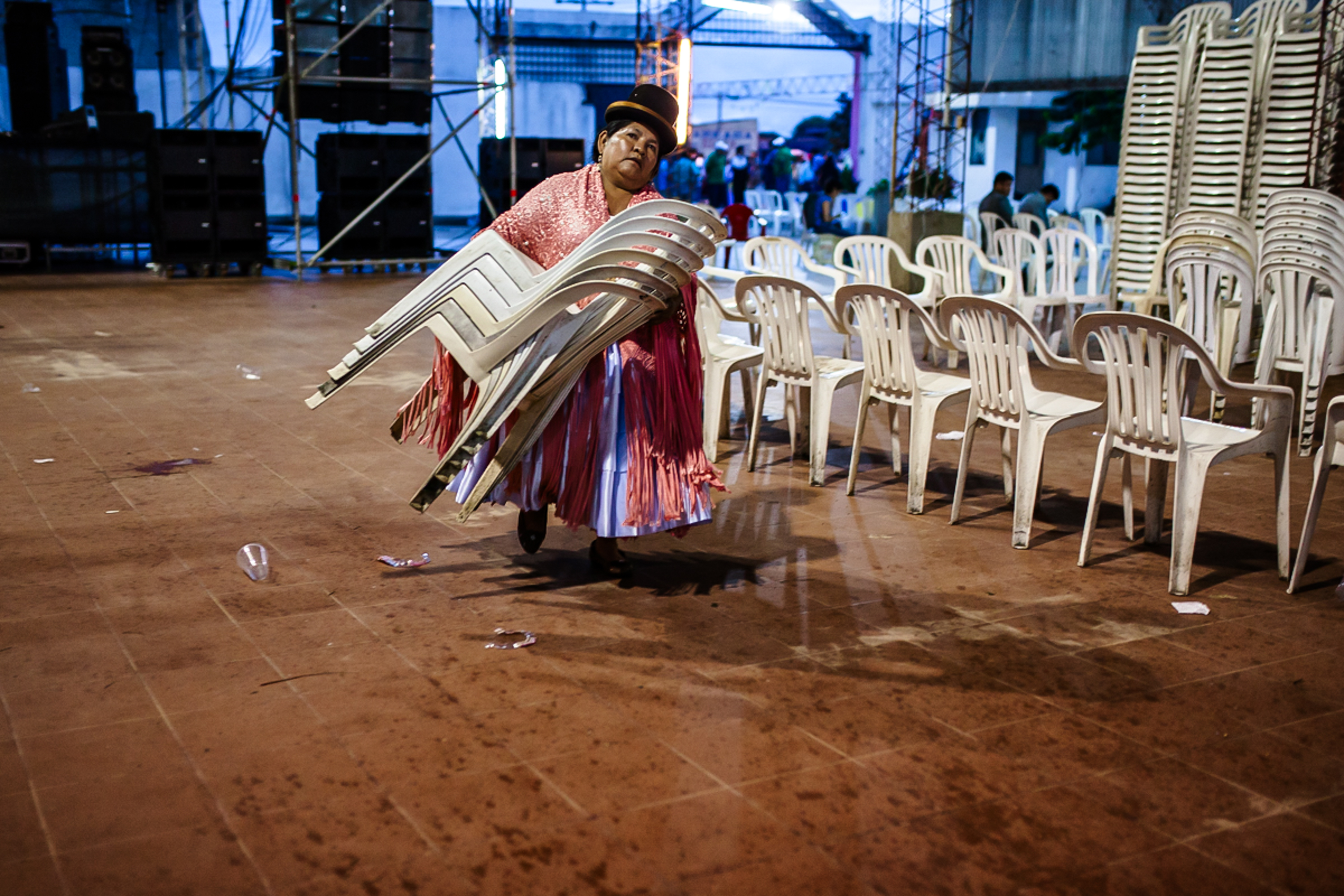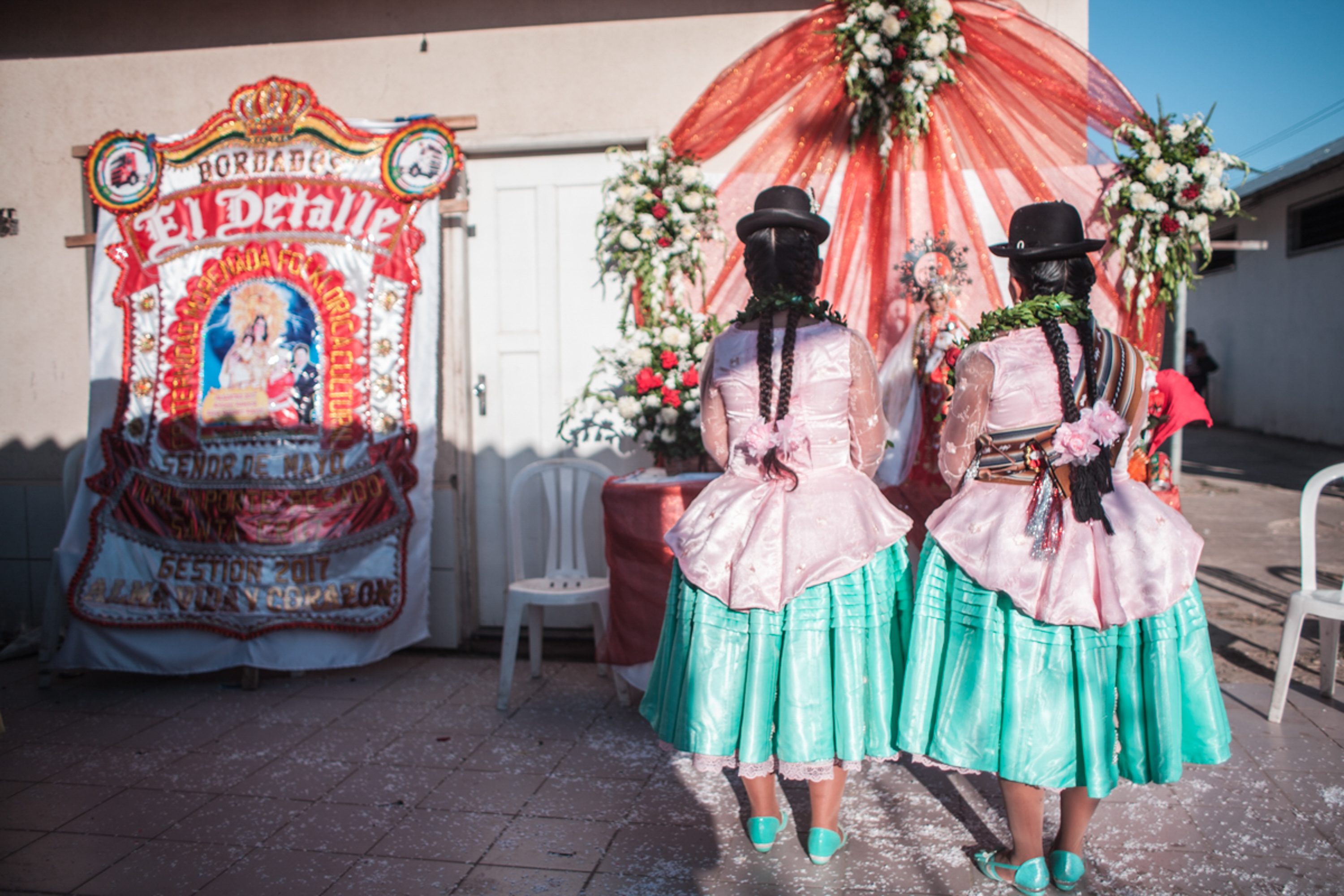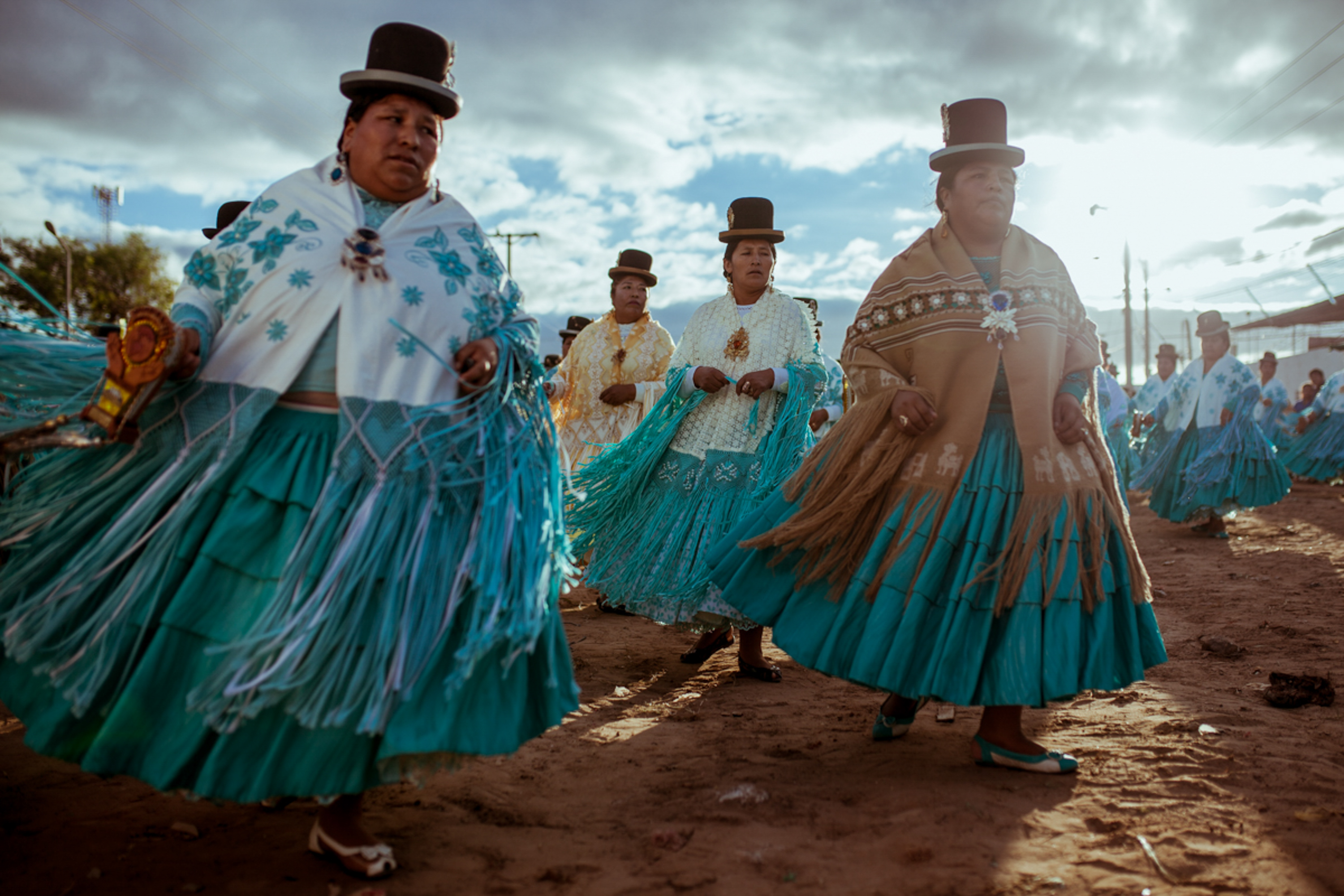 El folklore en Bolivia es una forma de expresión devocional y allí, como en muchos lugares del mundo, la danza y las celebraciones están íntimamente relacionadas. Entre las mujeres que bailan morenada, hay una apariencia de exceso y ostentación que al interior de la práctica funciona como un canal de comunicación entre lo humano y lo divino. En el despliegue del estatus económico que exhiben las cholitas, en la riqueza de sus trajes, hay también una amplificación material y sensorial en la que lo tangible es más una extensión del elemento espiritual que algo separado de él.