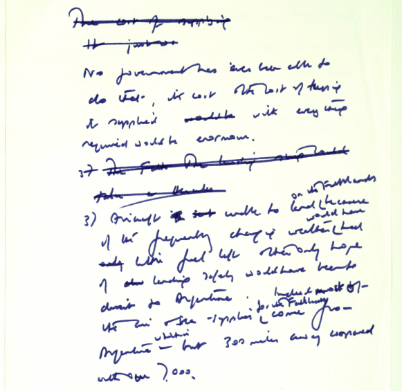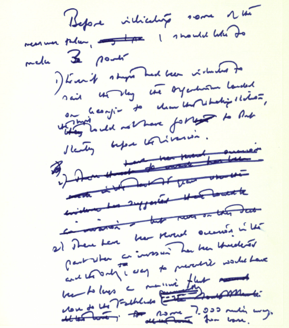 2. Han habido cantidad de ocasiones en el pasado, cuando [los argentinos] amenazaba con una invasión. La única manera de prevenirla hubiera sido mantener una flota masiva cerca de Falkland Islands, a unas siete mil millas de la base. Jamás un gobierno ha logrado hacer eso: cuesta muchísimo y el costo de mantener los suministros, con todo lo que requiere, sería de dimensiones monstruosas.