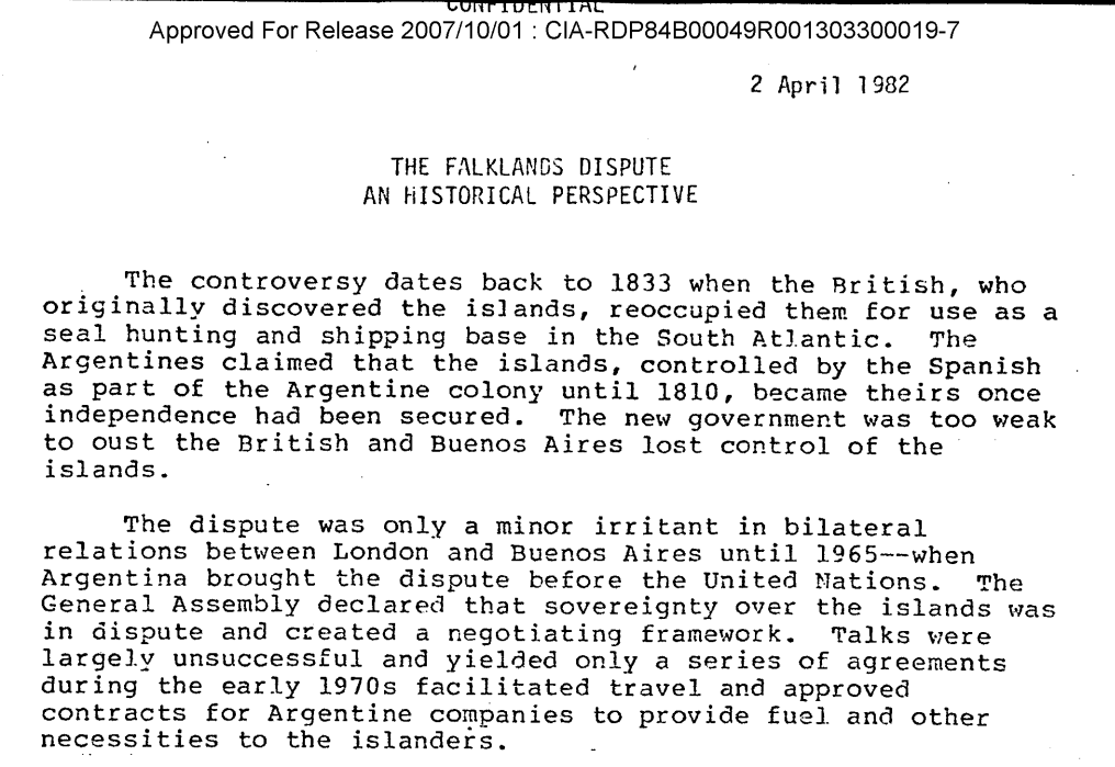 La misma CIA que miraba con admiración las fuerzas represivas desplegadas en nuestro país y las financiaba para operar en América Central, la misma CIA que estaba comprometida con el fin del comunismo en todos los rincones del mundo, el 2 de abril presentaba un brief con una curiosa perspectiva del conflicto histórico entre Argentina y el Reino Unido. Este resumen está lleno de datos sesgados, falsedades, imprecisiones y desinformaciones, y pretende saldar en unos pocos párrafos el conflicto territorial, vestigio del colonialismo, en el Atlántico Sur.